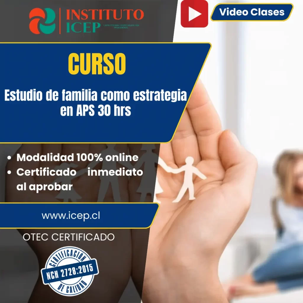 Estudio de Familia como Estrategia en APS es un curso 100% online y asincrónico de 30 horas cronológicas, diseñado para fortalecer el enfoque familiar en la Atención Primaria de Salud (APS). Aporta herramientas para comprender, diagnosticar e intervenir en la salud familiar desde una perspectiva integral y biopsicosocial, abordando la dinámica familiar, crisis y factores de riesgo y protección. Está dirigido a profesionales de la salud, trabajadores sociales y otros actores del área psicosocial que deseen mejorar sus competencias en el estudio e intervención de familias. Al finalizar, los participantes recibirán un certificado de aprobación.